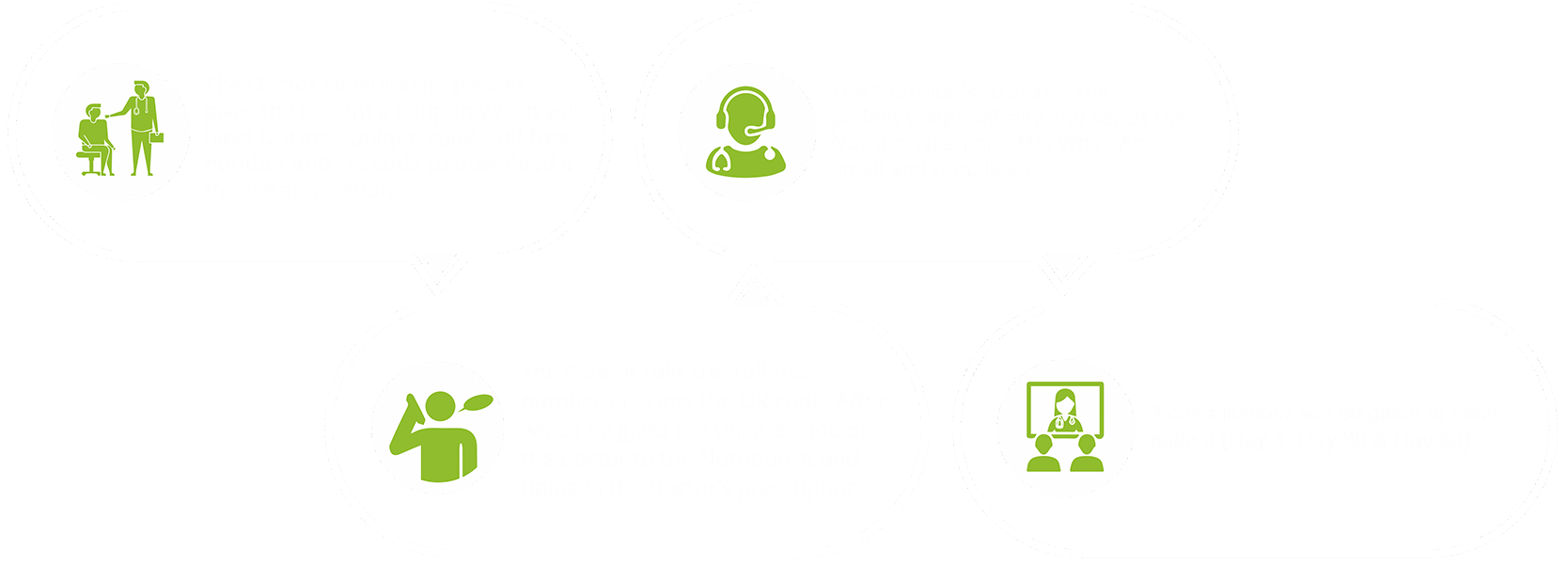 • Each patient referred by the Doctor will be consulted thrice in the entire program, on Day 1, Day 30 & Day 60. On the recommendation of the Doctor, the service can be extended.